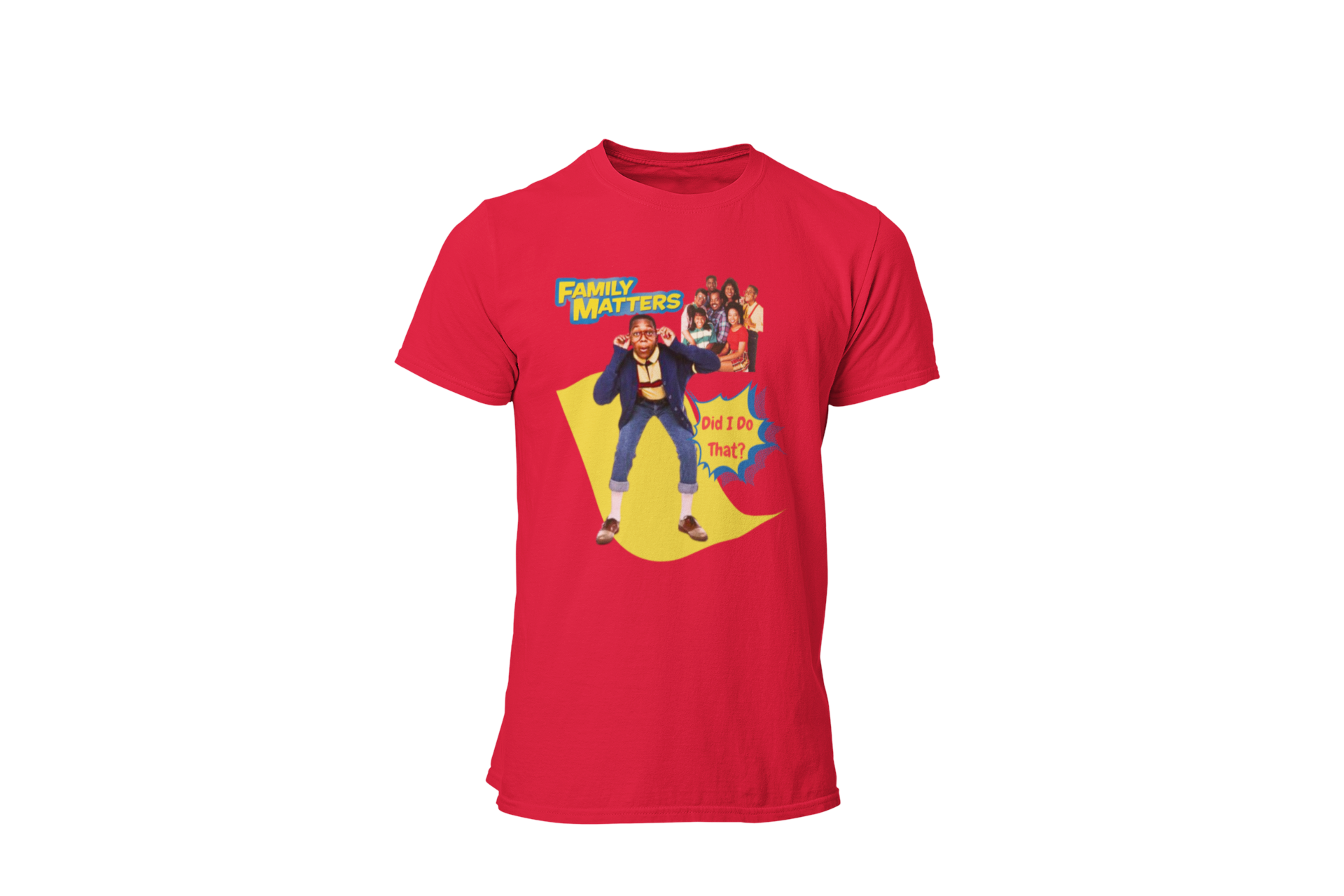 The Winslow Family comes to life on this tee—police officer Carl Winslow, his wife Harriette, and their kids Eddie, Laura, and Judy. Steve Urkel, the lovable nerdy neighbor with his signature high-pitched voice, suspenders, and unforgettable catchphrase "Did I do that?" steals the show. Wear this iconic graphic and get ready to hear that classic line all day long.