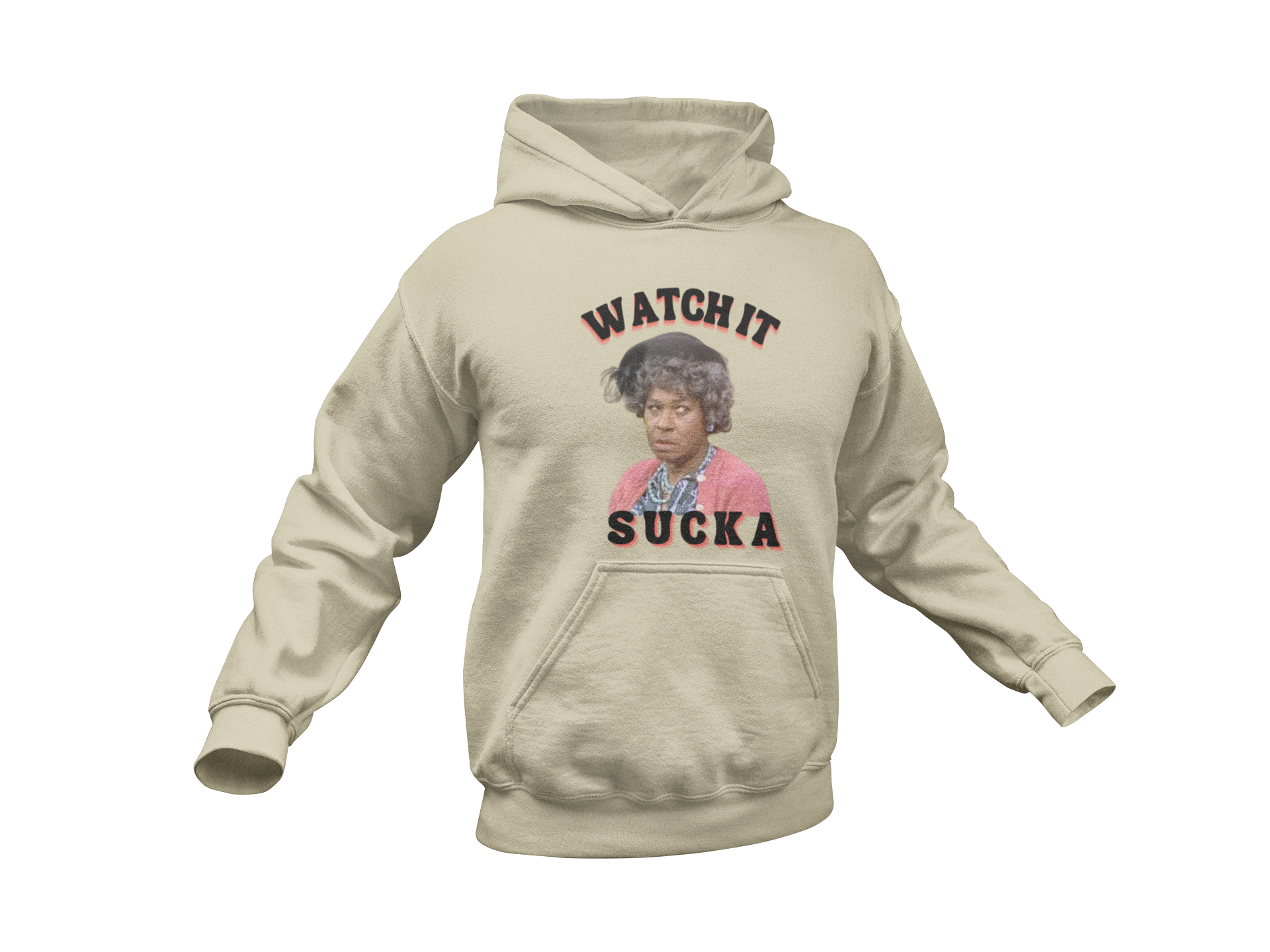 This Sanford and Son show custom graphic features Aunt Esther face and those famous words "Watch It Sucka,". This iconic phrase was always sparked after one Fred's signature jabs at Lamont's favorite aunt. The smiles will be coming as you rock this graphic design.